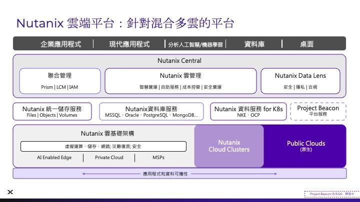 Project Beacon 首次在 .NEXT 上宣布,是 Nutanix 隨時隨地提供資料計畫的第一步。它將應用程式和資料與基礎設施解耦。首先將 Nutanix 資料庫服務 (NDB) 作為公有雲中的託管服務提供。 Nutanix 計劃最終透過與 Kubernetes 整合的單一應用程式介面 (API) 和控制台來提供平台服務。 Project Beacon路線圖包括資料流、訊息傳遞、快取和人工智慧/機器學習 (ML)。預計 2024 年提供搶先體驗版(EA)。
